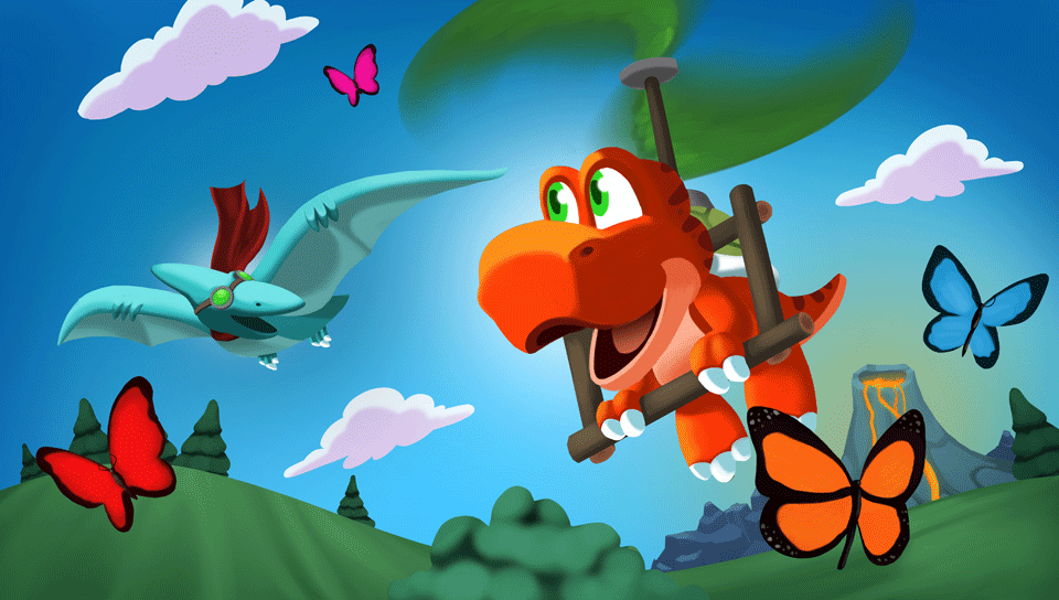 I served as the lead artist on T-Rex Rush: Dinogliders, which is an education children's game for Leapfrog. The game teaches kids about both spelling and dinosaurs. Leapfrog wanted us to create a lush world with all sorts of plant and animal life existing within it. Taking into account the small screens of the devices it would be played on, I focused on adding detail, but keeping things still very bright and stylized so they would read even at a small scale.